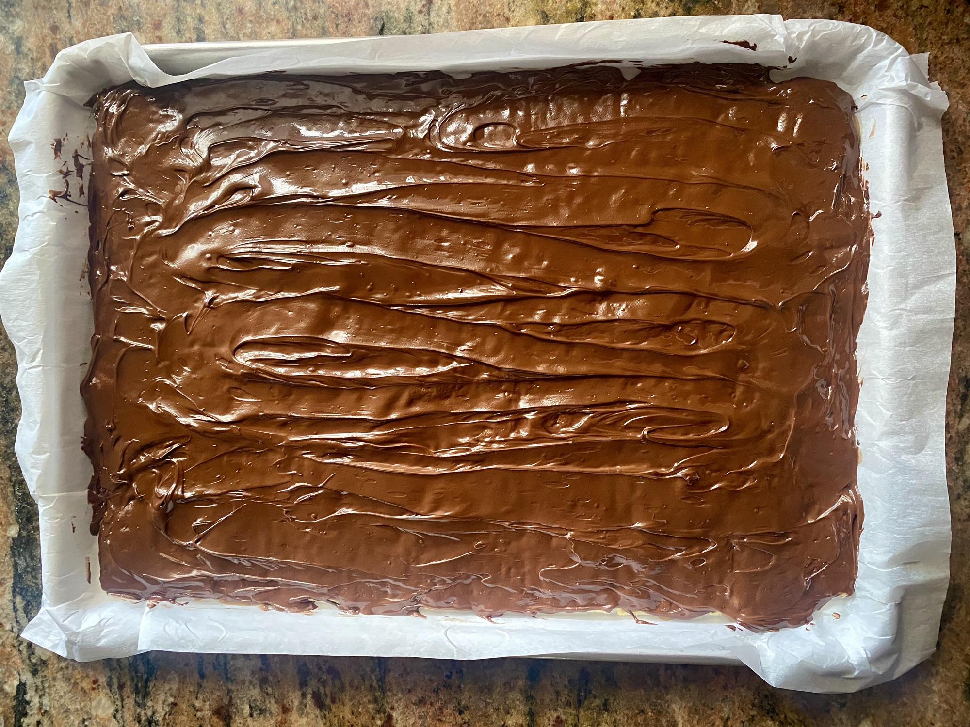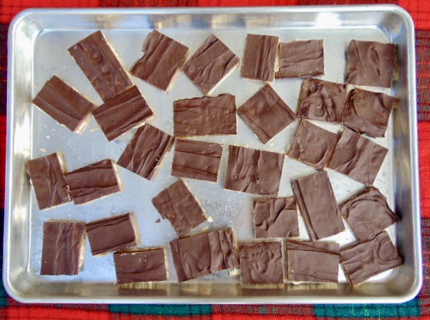- Sprinkle chocolate chips over the hot layer and let sit for a few minutes. Spread melted chocolate evenly across the hot toffee layer.
